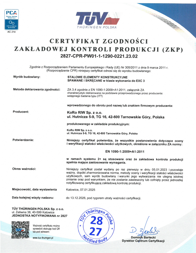 Posiadamy certyfikowaną Zakładową Kontrolę Produkcji (ZKP) w najwyższej, wymagającej klasie wykonania EXC3 dla stalowych elementów konstrukcyjnych (spawanych i skręcanych). Oznacza to, że możemy wytwarzać elementy konstrukcji nośnych podlegające zmęczeniu materiałowemu lub o dużym znaczeniu dla bezpieczeństwa publicznego, gdzie standardowa klasa EXC2 jest niewystarczająca.