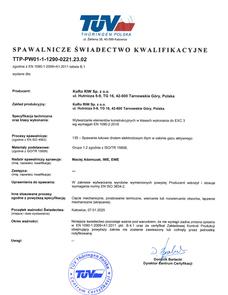 To świadectwo, wystawione przez TÜV Thüringen Polska, stanowi formalne potwierdzenie najwyższych kompetencji technicznych KoRo RIW w zakresie wytwarzania stalowych elementów konstrukcyjnych zgodnie ze specyfikacją EN 1090-2:2018. Dokument ten kwalifikuje nasz zakład produkcyjny w Tarnowskich Górach do realizacji projektów w rygorystycznej klasie wykonania EXC3.